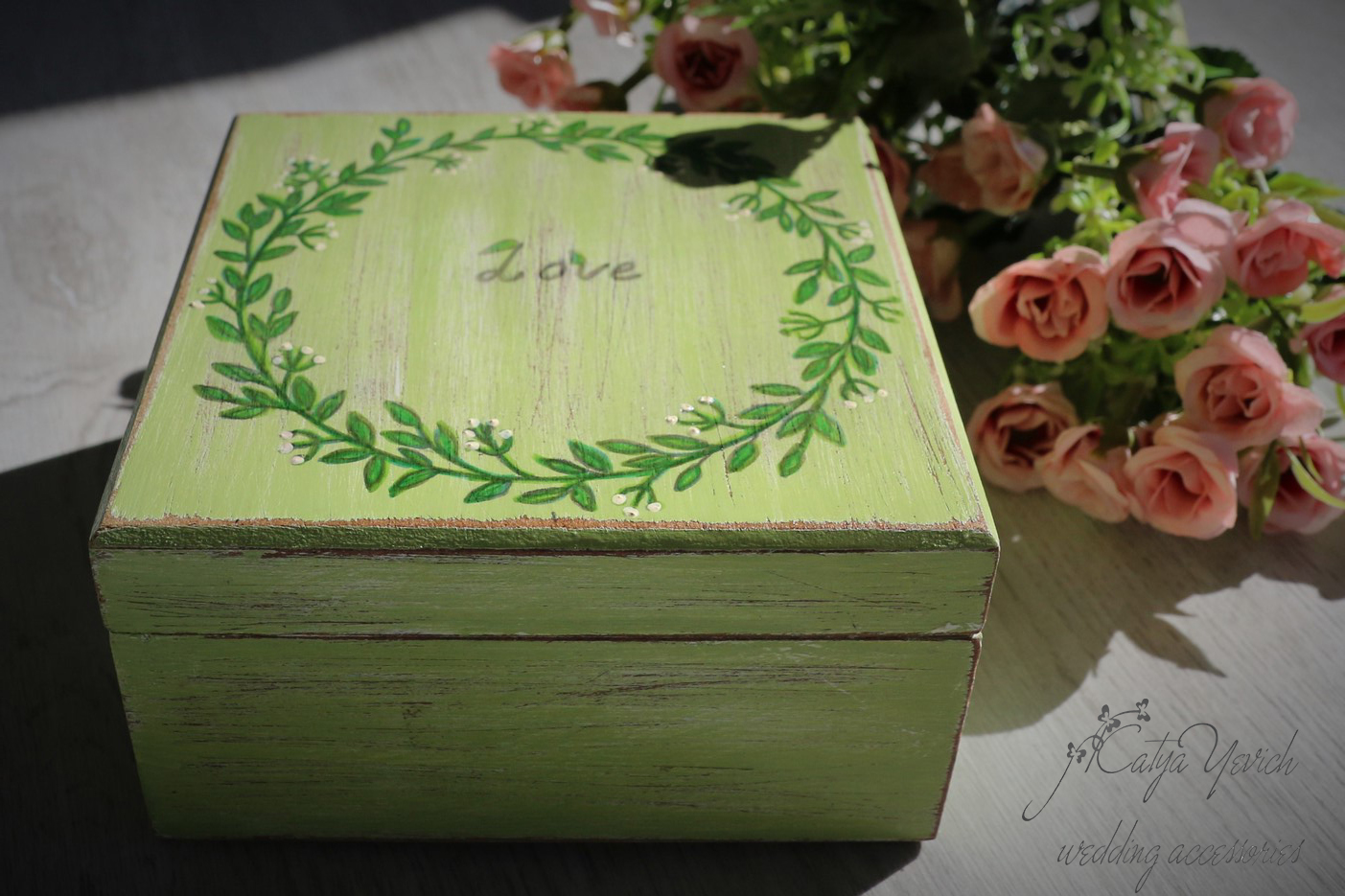 Шкатулка для колец в стиле Прованс с инициалами молодоженов и розами внутри.